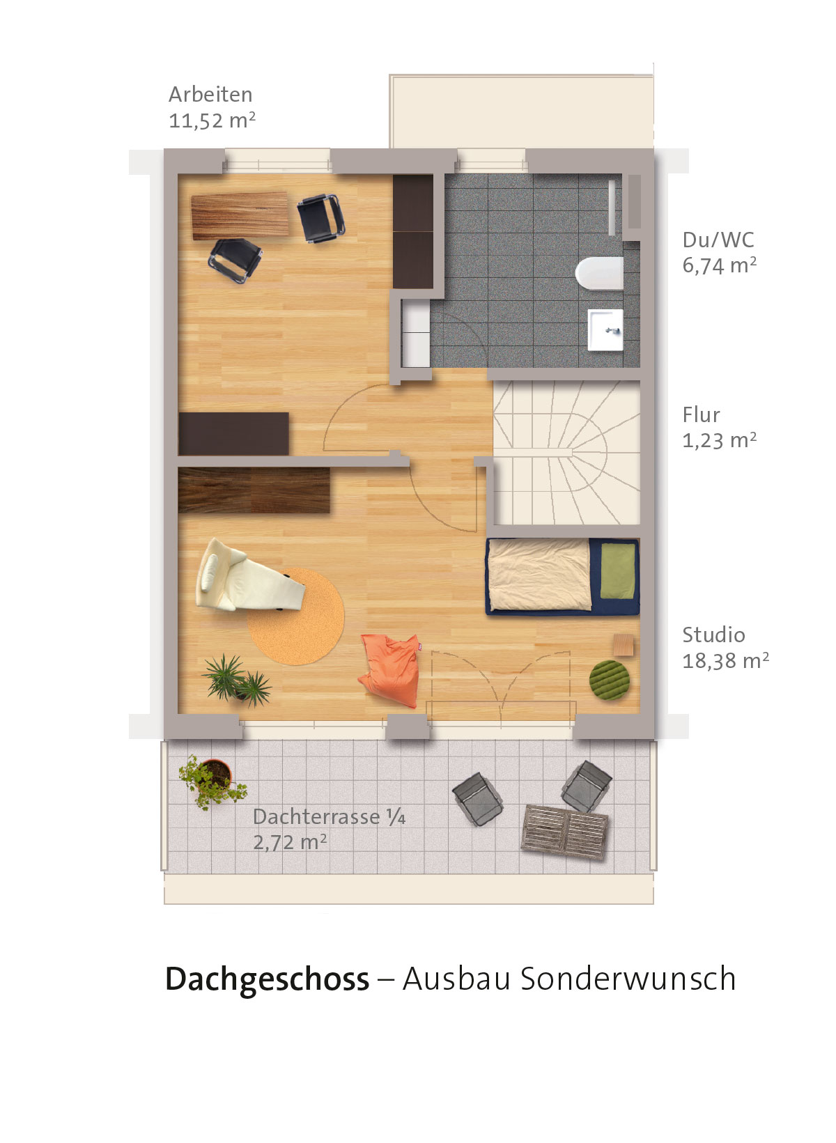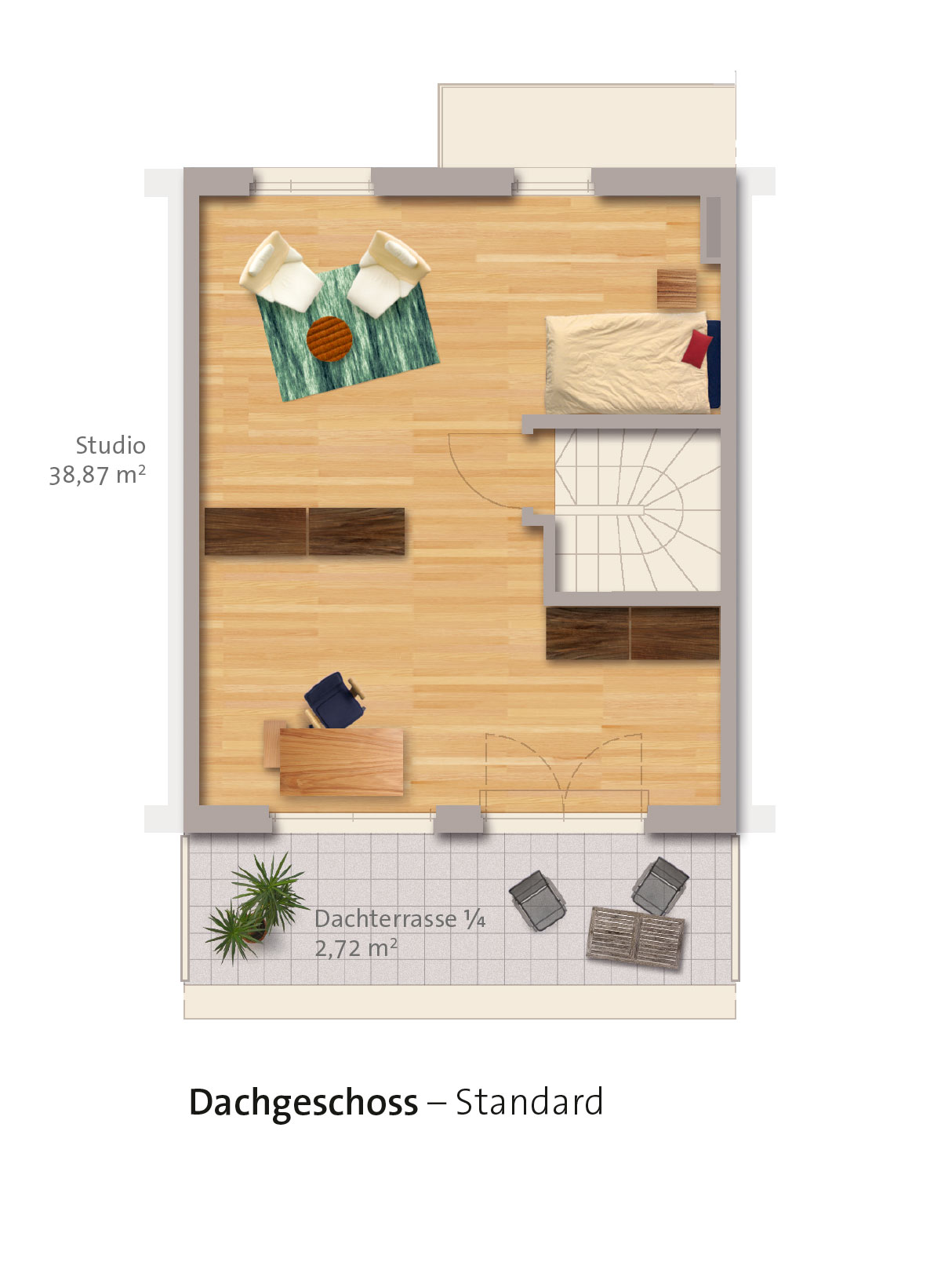 - Großes Studio im Dachgeschoss (individuelle Gestaltungsmöglichkeiten als Sonderwunsch)