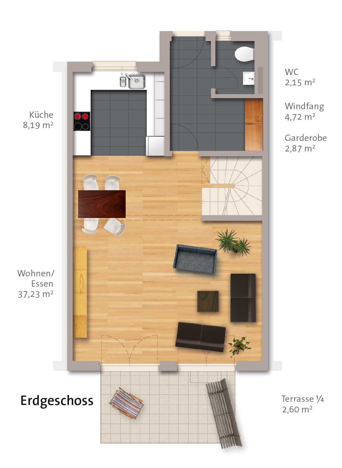 Drei raumhohe Wohnetagen plus hausbreite Dachterrasse